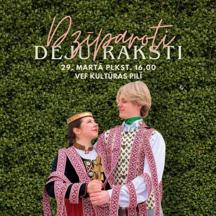 29. martā plkst. 16.00  VEF Kultūras pilī norisināsies latviešu tautas deju koncerts “Dzīparoti deju raksti”, kurā kolektīvi atrādīs sagatavoto repertuāru II Jauniešu Deju svētkiem – “Viens apvārsnis. Tūkstošiem ceļu”, kas notiks šī gada maijā Liepājā. Kolektīvi turpina kopt, attīstīt un popularizēt latviešu tautas dejas tradīcijas. Galvenais dejā – rast prieku, sajust daudzveidīgo ritma pasauli, atklāt dejas burvību un ar krāšņiem dzīpariem savīt soļus vienā lielā deju rakstā.